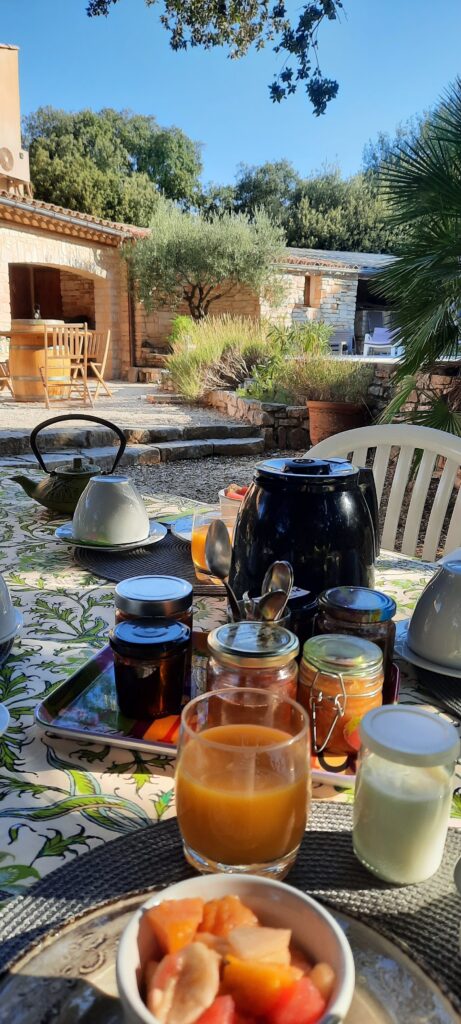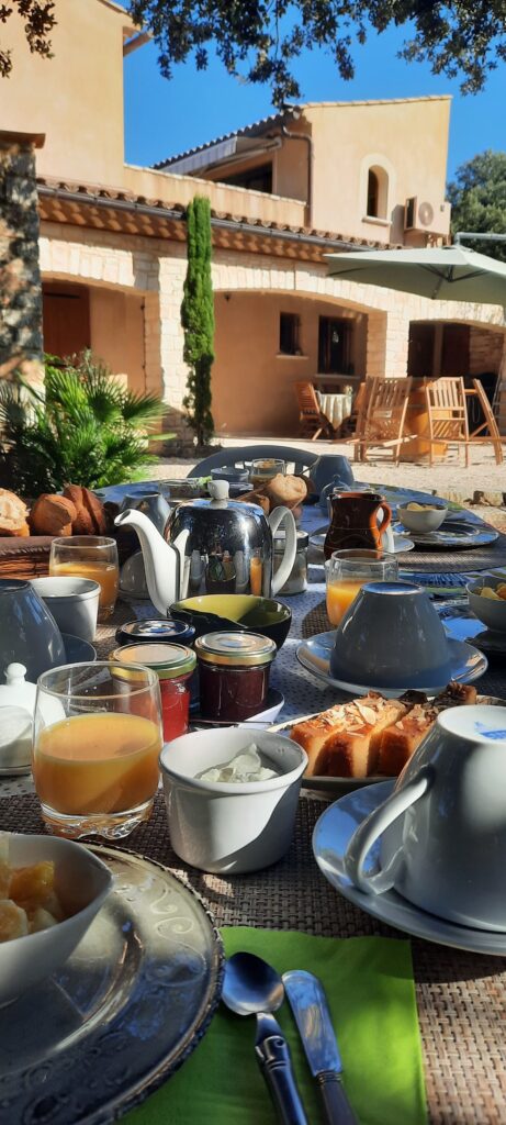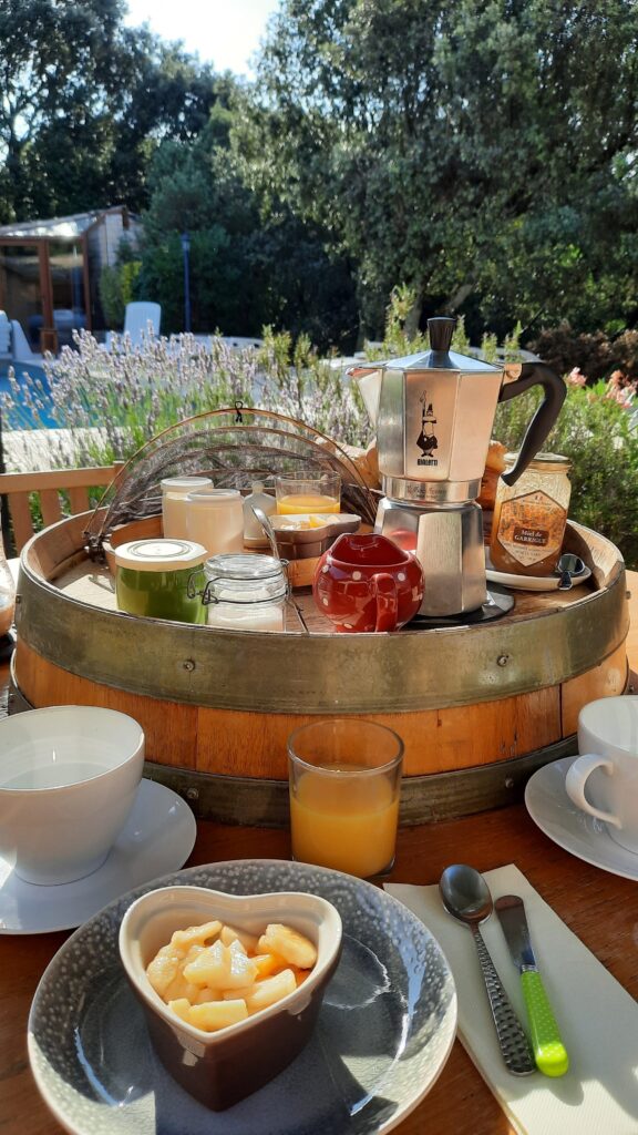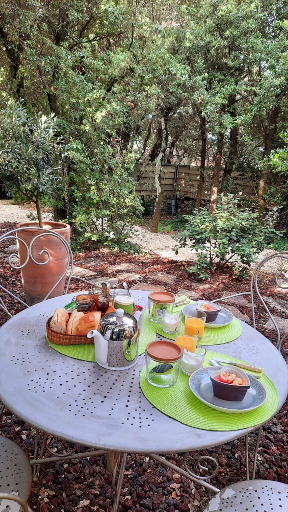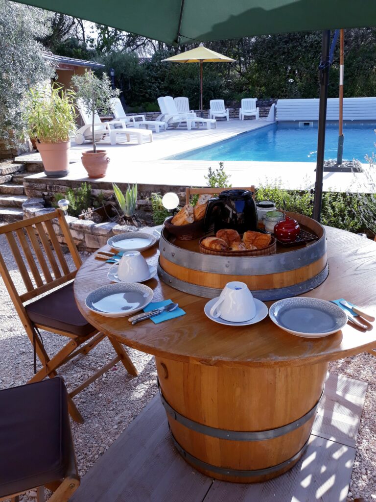 A l’ombre des chênes verts et à proximité de la piscine, vous partagerez votre petit-déj avec les autres hôtes (table de 8 personnes maxi).