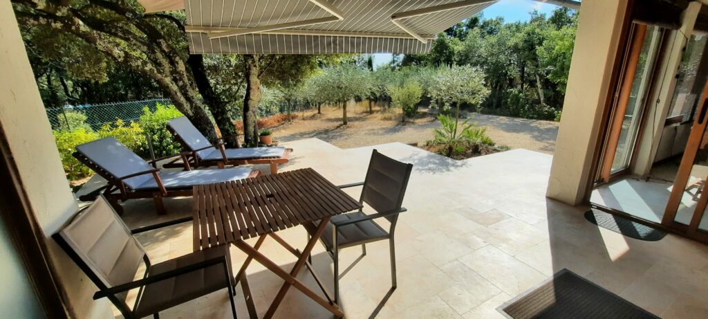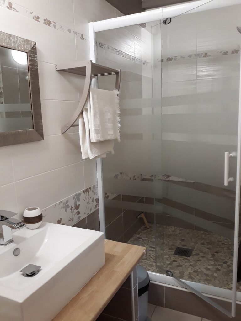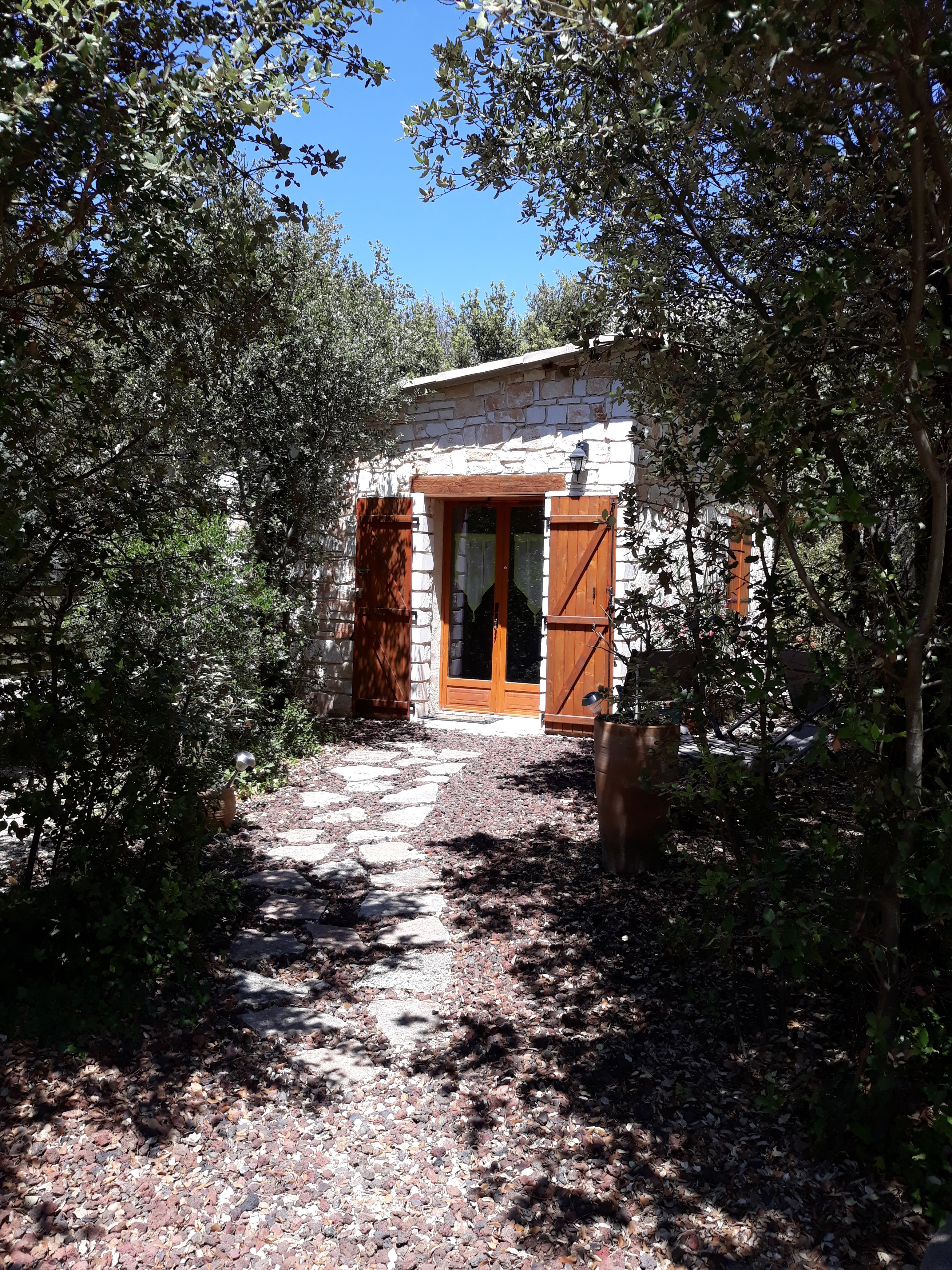 C’est une construction de 20 m2 comprenant un vestibule équipé d’un petit frigo, une chambre avec un lit en 160, un cabinet toilette (douche, lavabo, sèche-cheveux) et un WC séparé. Elle est équipée d’une climatisation fixe.